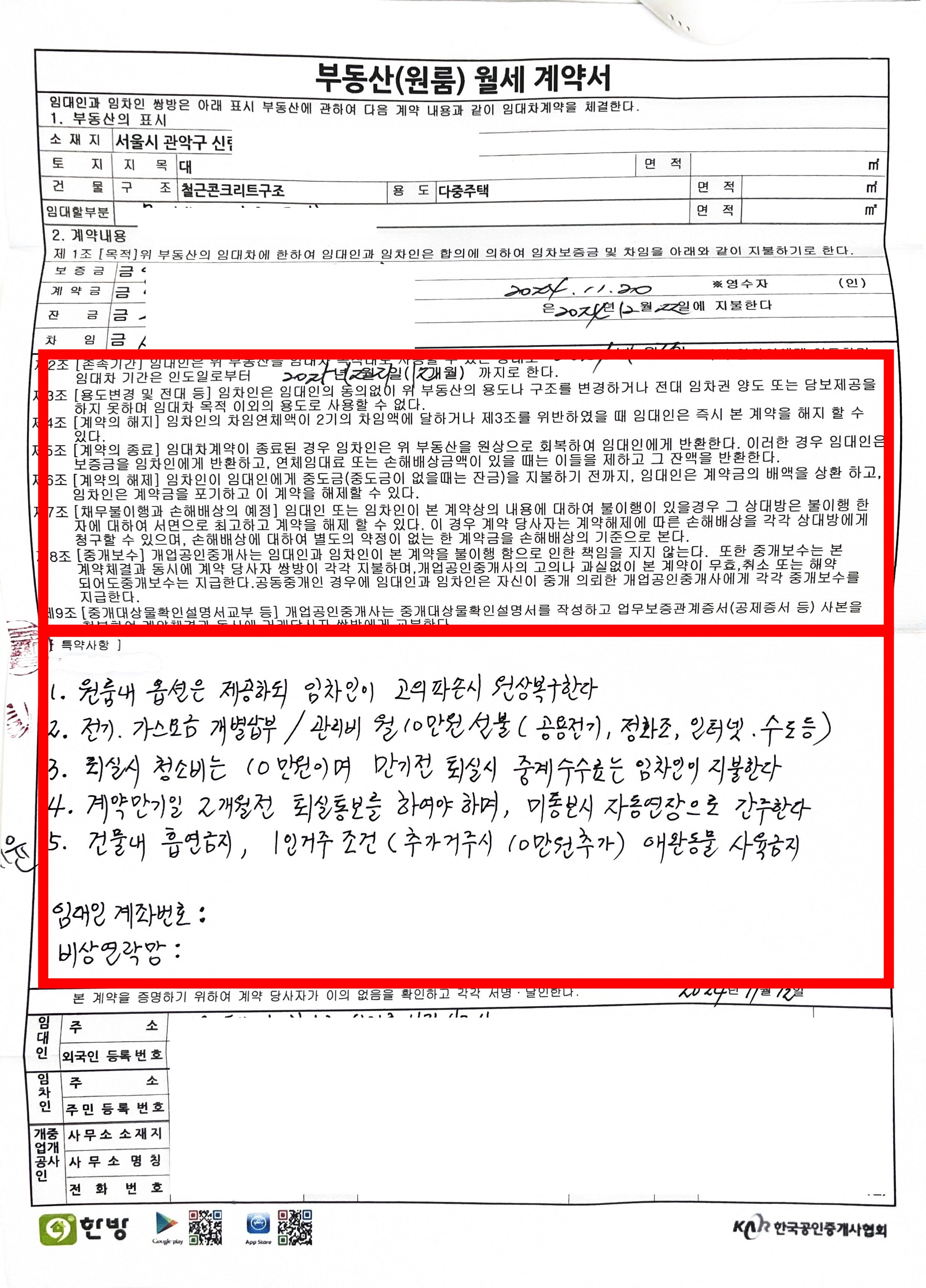 계약서 첫 장에는 반드시 집주인의 이름, 주민등록번호, 연락처, 주소가 정확하게 기재되어야 합니다. 아들은 처음에는 임대인과 임차인의 개념에 대해서도 헷갈려했어요.